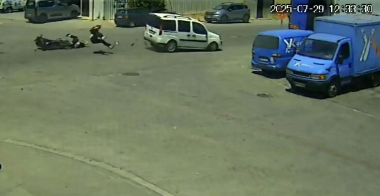 AYDIN’ın Efeler ilçesinde, hafif ticari araçla çarpışan motosikletteki 1’i ağır, 2 kişi yaralandı. Kaza, güvenlik kamerasına yansıdı.