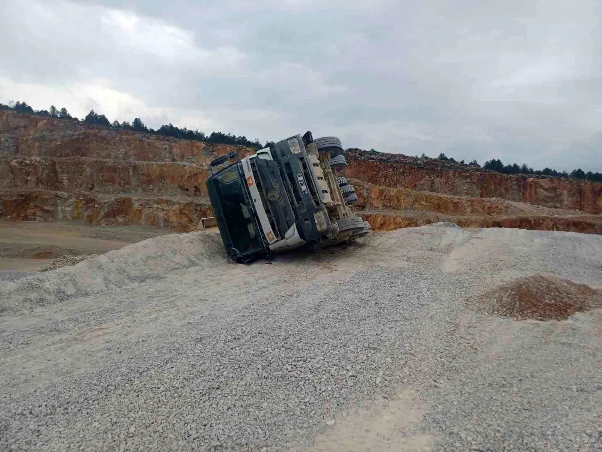 Bilecik’in Necmiye Köyü bölgesinde bulunan inşaat şantiyesinde geri hareket yapan kum yüklü kamyon yan yatarak devrildi.