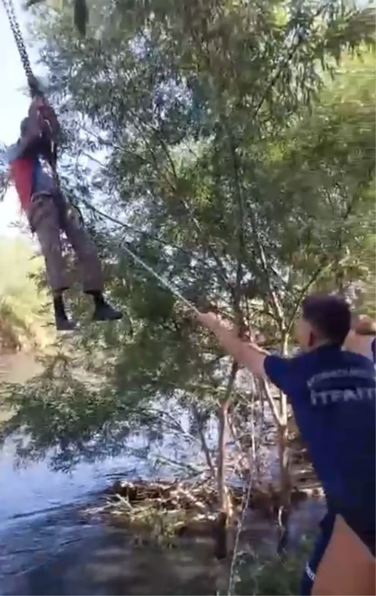 AYDIN’ın Efeler ilçesinde Büyük Menderes Irmağı’ndan traktörüyle geçmek isterken su düzeyinin ansızın yükselmesiyle mahsur kalan çiftçi B.Y., vinçle kurtarıldı. O anlar, cep telefonuyla kaydedildi.