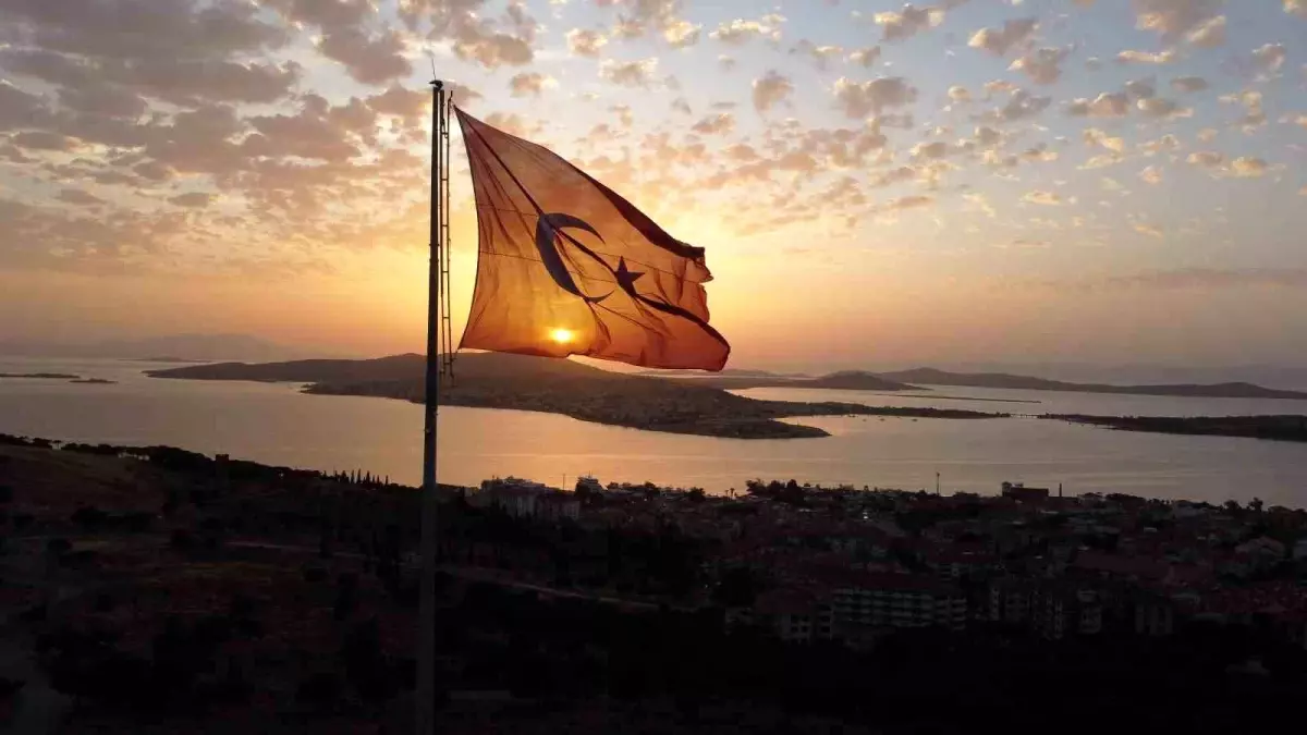 Balıkesir’in Ayvalık ilçesinde Cennet Zirvesi’nde bulunan dev Türk bayrağı, gün batımında Ayvalık Adaları görüntüsüyle kartpostallık imgeler oluşturdu.