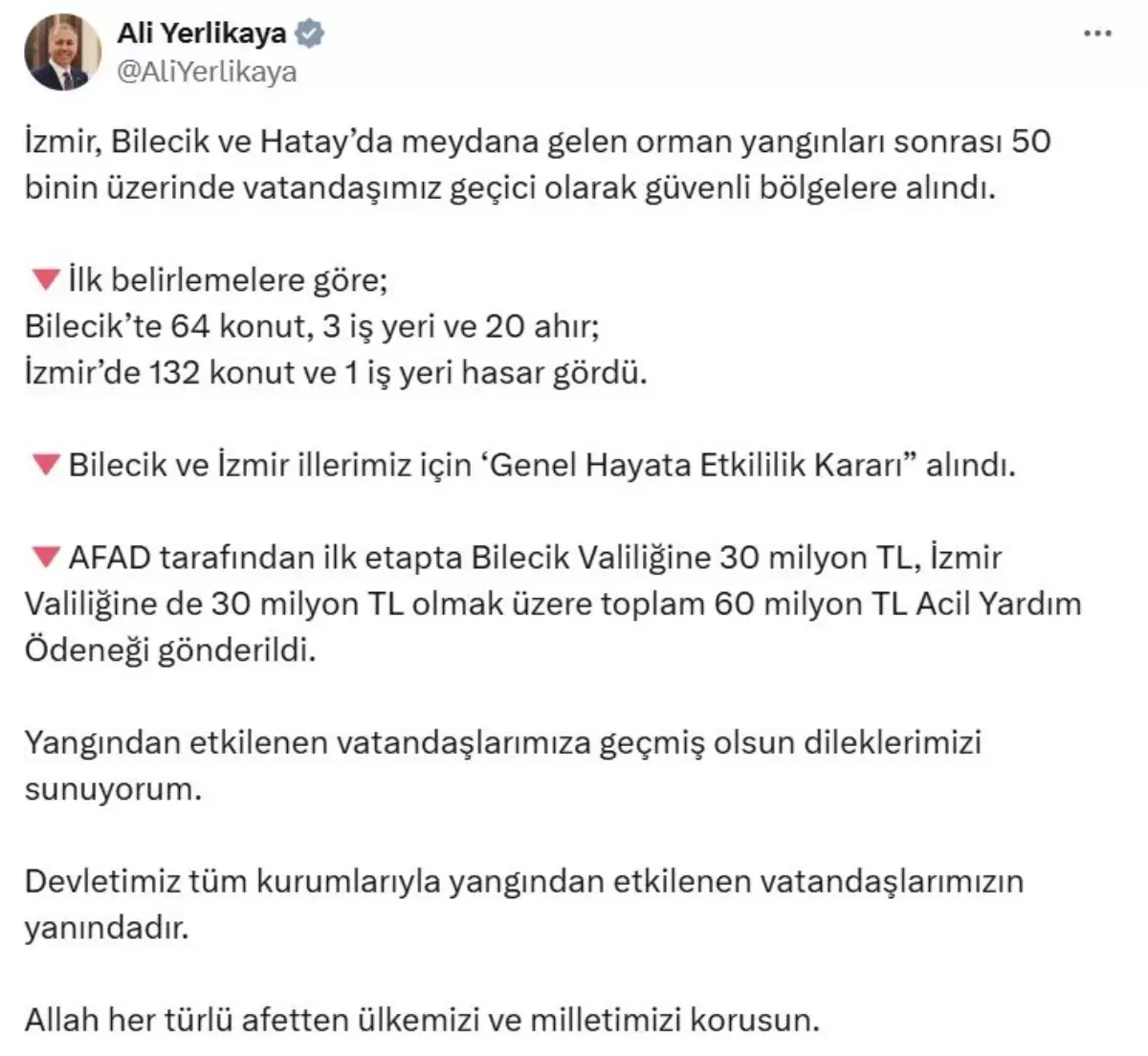 İÇİŞLERİ Bakanı Ali Yerlikaya, İzmir, Bilecik ve Hatay’da meydana gelen orman yangınları sonrası 50 binin üzerinde vatandaşın süreksiz olarak inançlı bölgelere alındığını belirterek, “AFAD tarafından birinci etapta Bilecik Valiliğine 30 milyon TL, İzmir Valiliğine de 30 milyon TL olmak üzere toplam 60 milyon TL acil yardım ödeneği gönderildi” dedi.